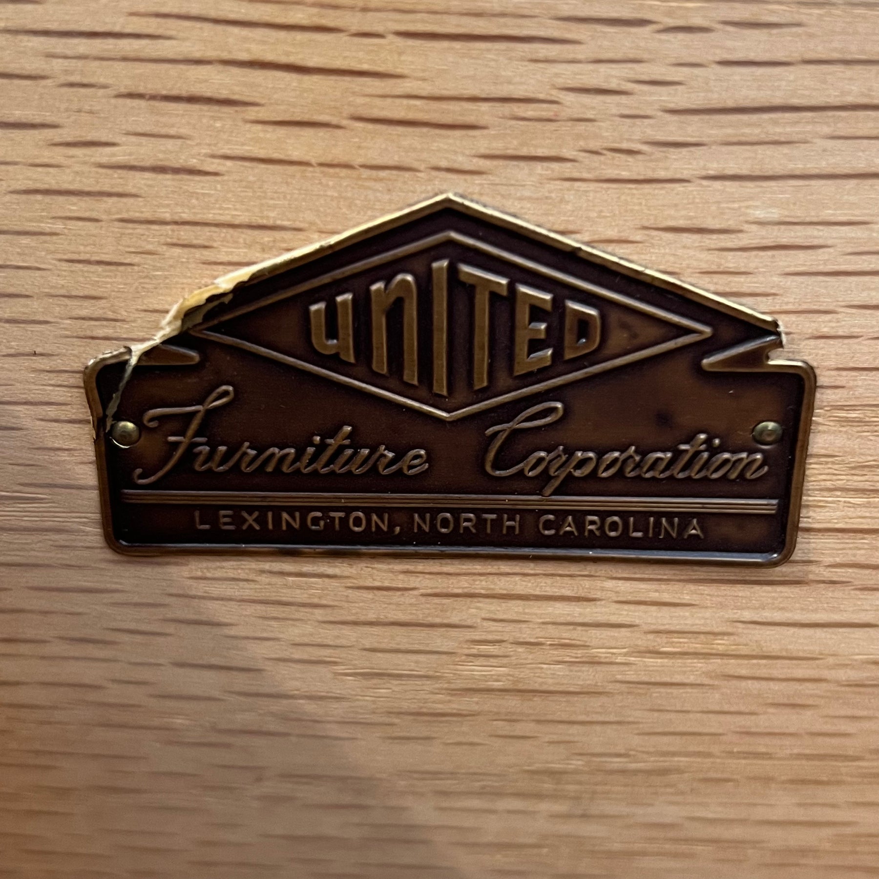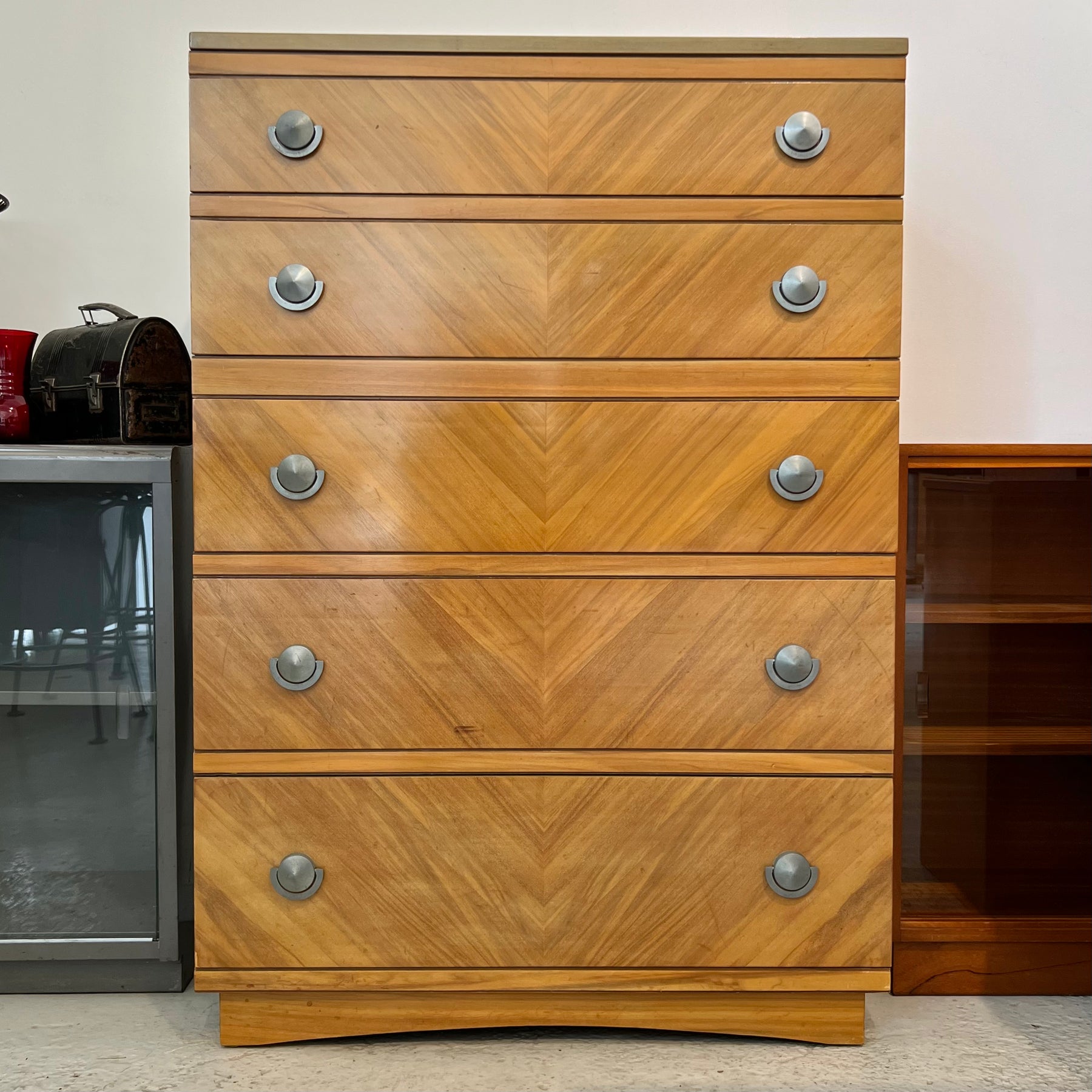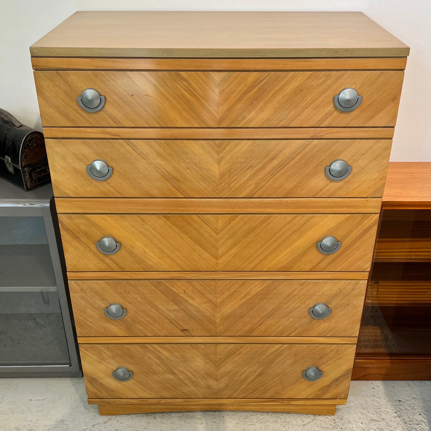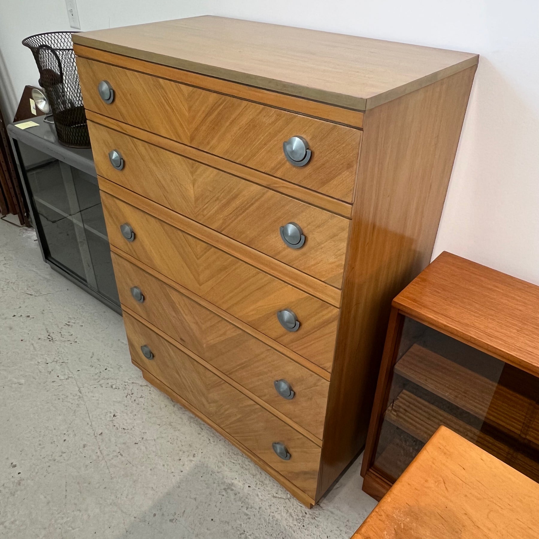 Sharp ‘50s-era 5-drawer tallboy dresser from United Furniture Corp. Nice modernist pulls and symmetrically matched veneer on the drawers.