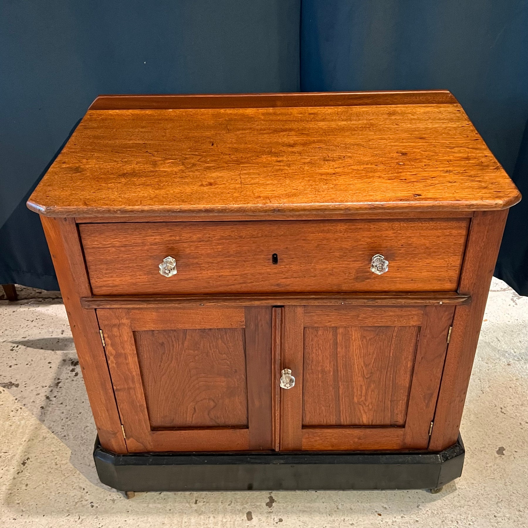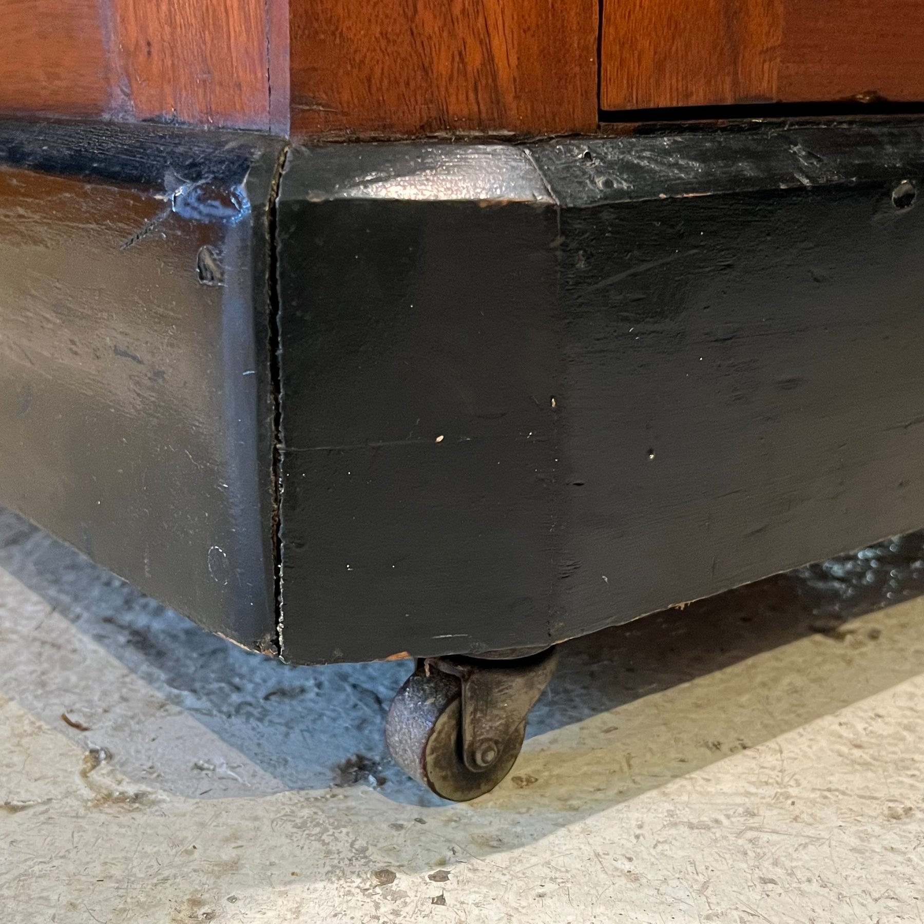 Unique antique walnut cabinet on casters. Great for use as an entryway key drop or kitchen storage. Original glass knobs. Base is painted in a glossy black lacquer.