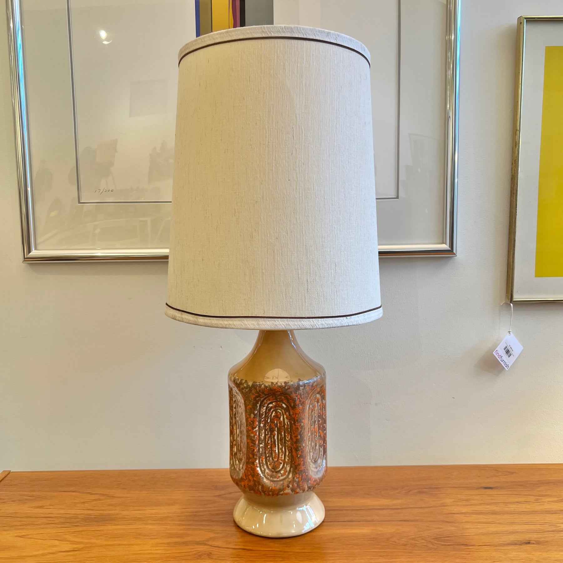 1960s-era ceramic lamp with orange and brown textured pattern on tan base. 3-way switch w/new LED bulb. Very faint stain on part of shade.