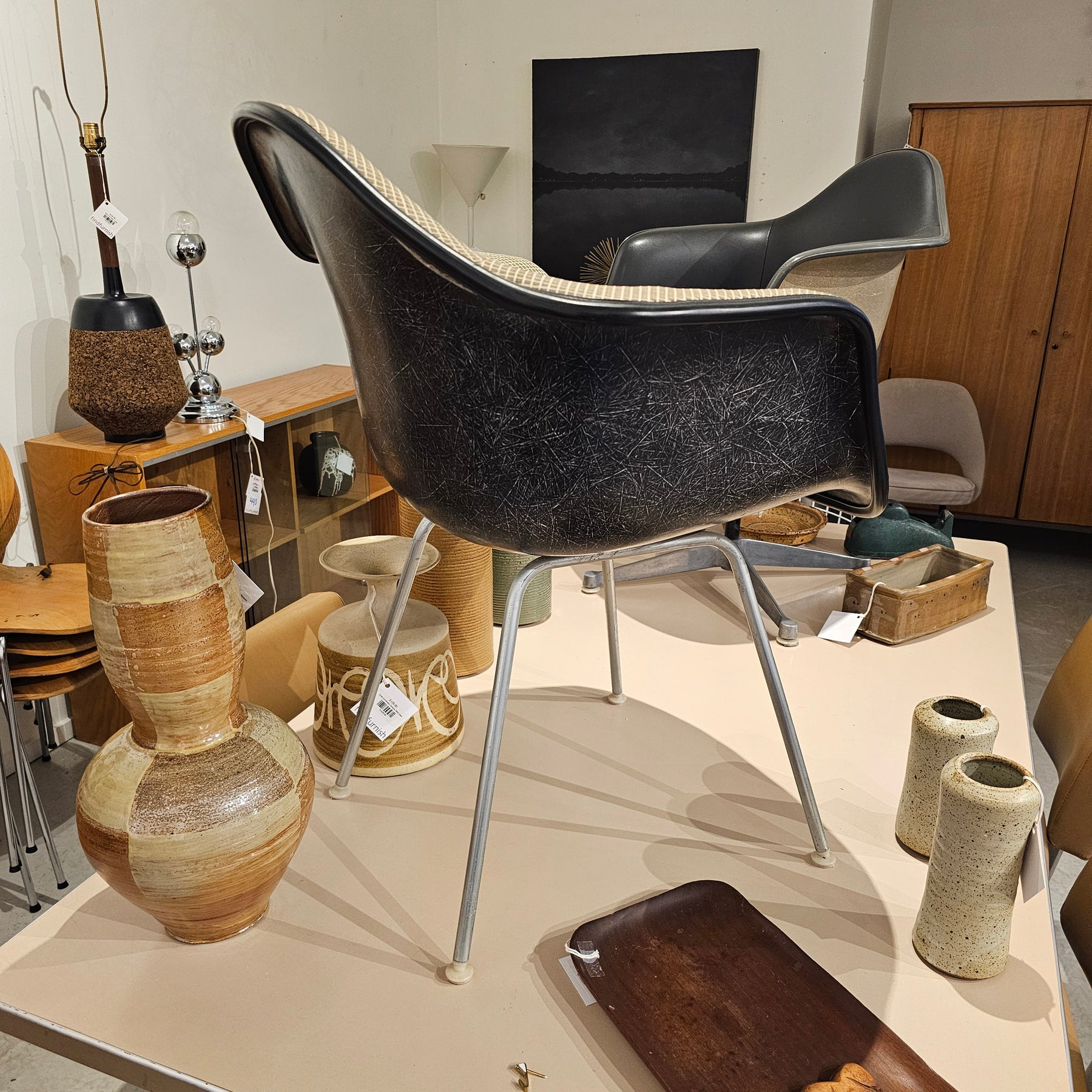 The 2nd Gen Eames Side Chair boasts its original upholstery, which is in fair/good condition. The stylish fiberglass frame may have some noticeable scuffs and marks.