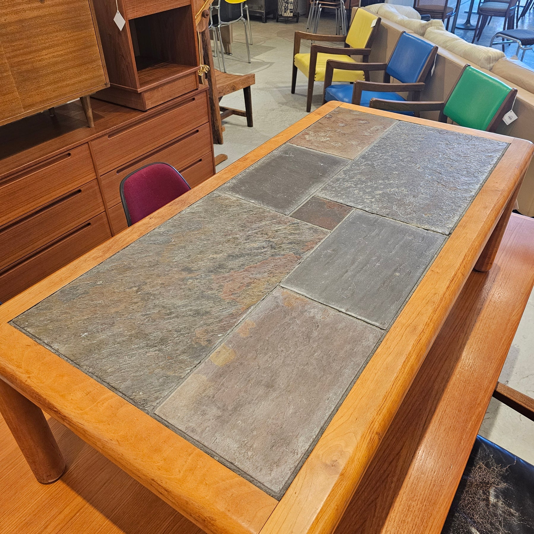 MCM Slate Tile Top Coffee Table by Haslev. Some minor signs of cosmetic wear present, primarily to legs of piece.