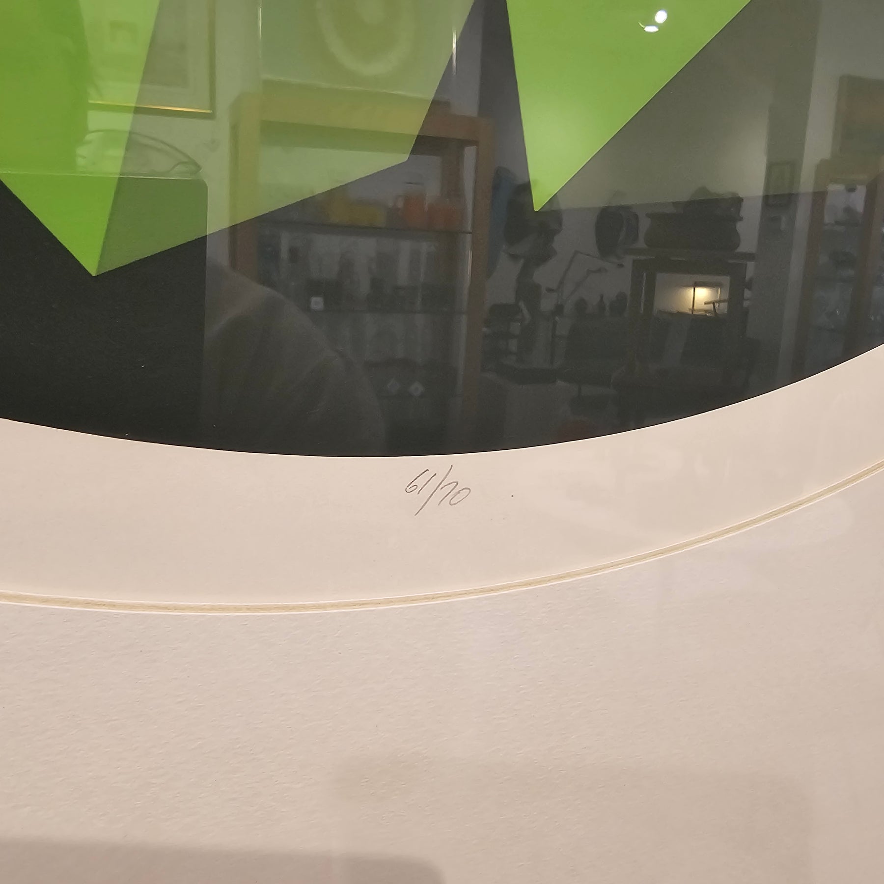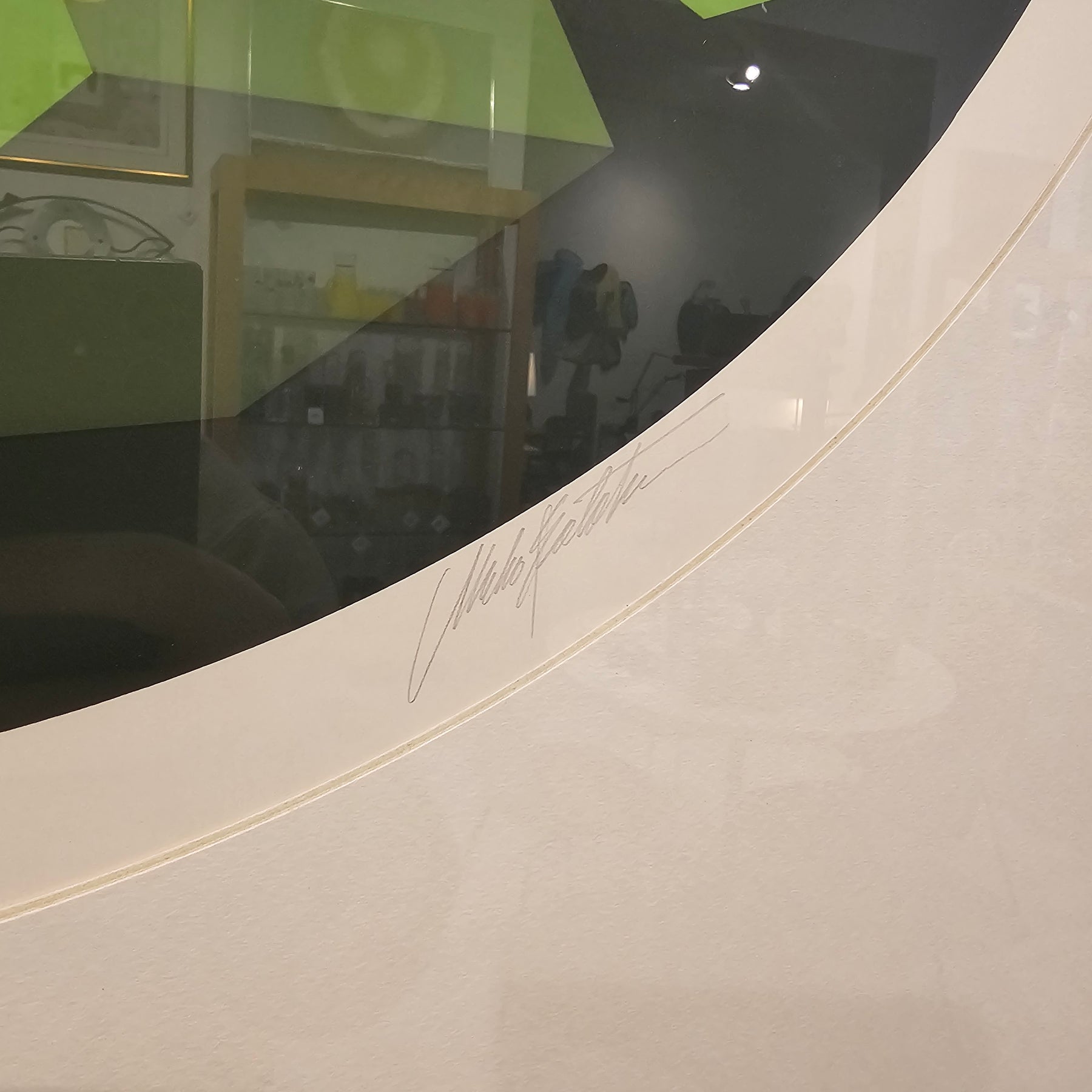 Housed in a custom yellow frame with round matting, this piece amplifies its vivid palette while giving a nod to the artist’s saturated, architectural sensibility. A visually striking addition to any modern or postmodern collection—where color, composition, and control converge.
