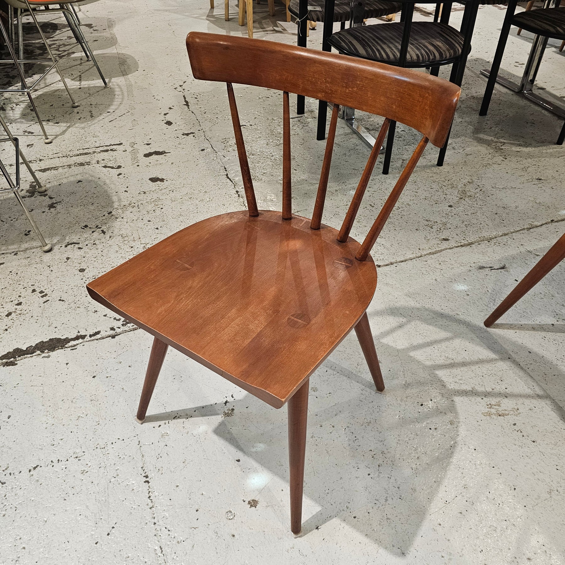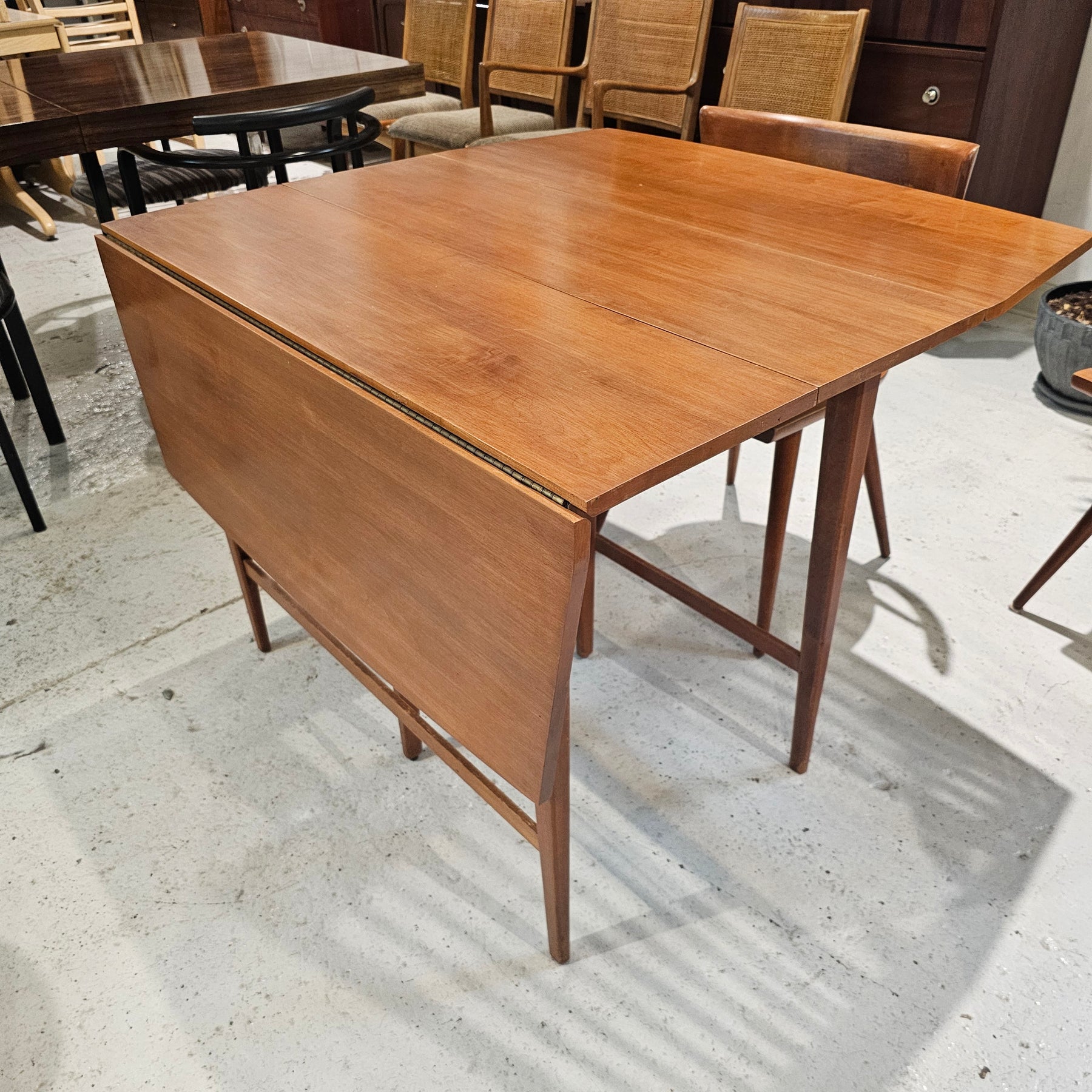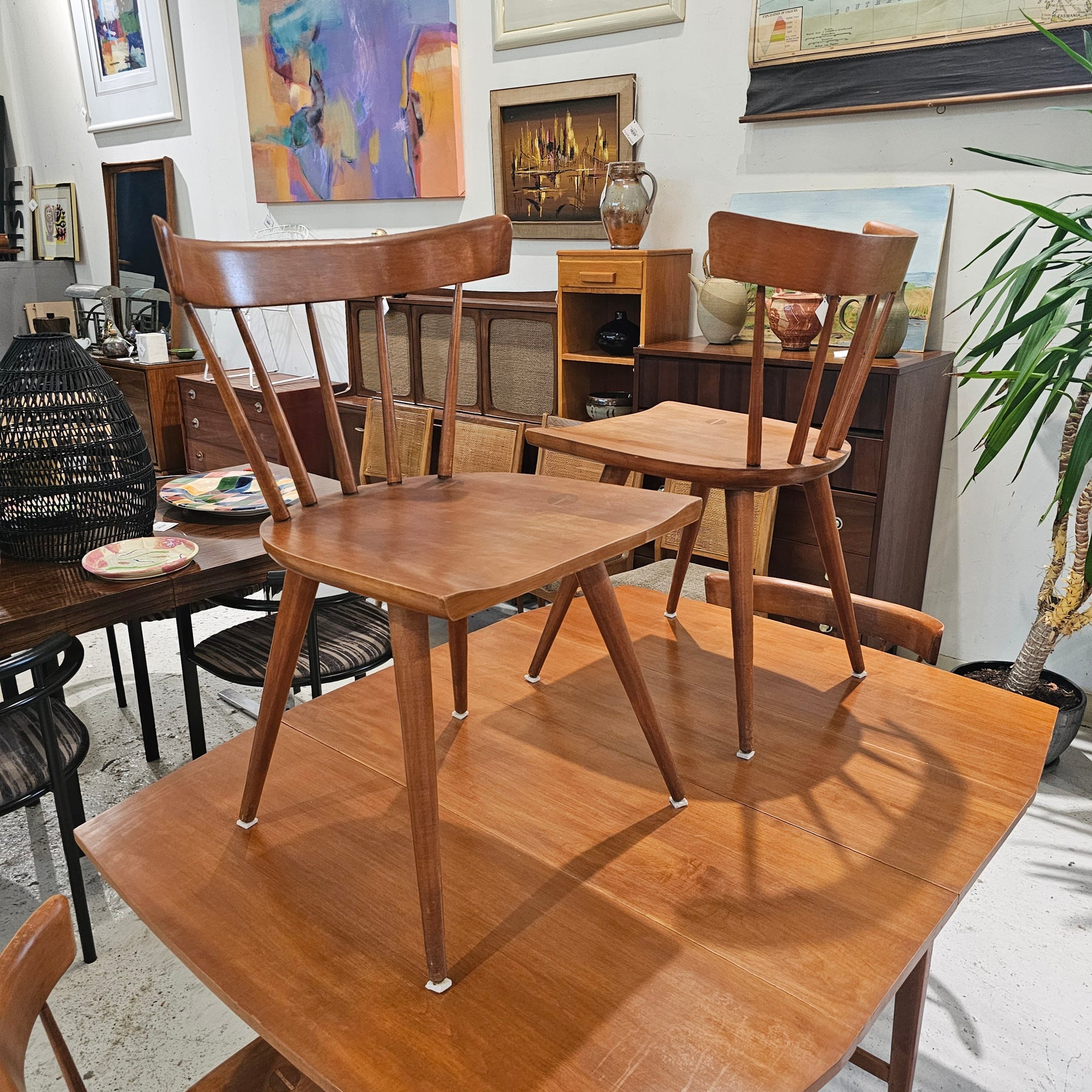 This Paul McCobb Planner Group dining set, crafted in the 1950s by Winchendon Furniture, features a versatile solid maple drop-leaf table and four matching chairs with McCobb’s signature screw-top seats and sculpted backrests. The clean, minimalist lines and warm maple finish exemplify mid-century modern design, while the drop-leaf functionality allows the table to transition easily from a compact footprint to full dining capacity. The set is in overall good vintage condition, structurally sound with light wear consistent with age, making it both a practical and iconic addition to any dining space.