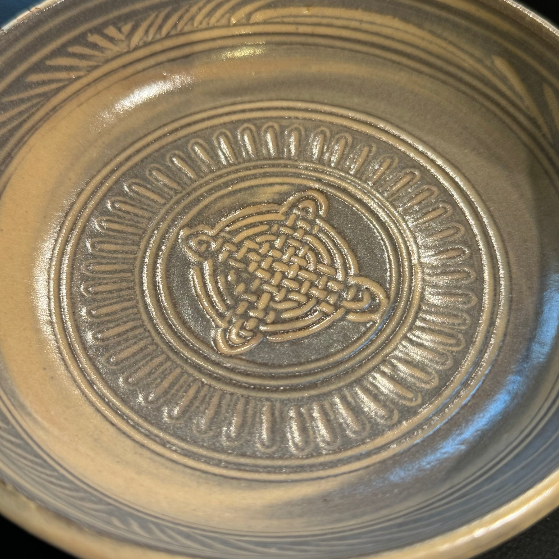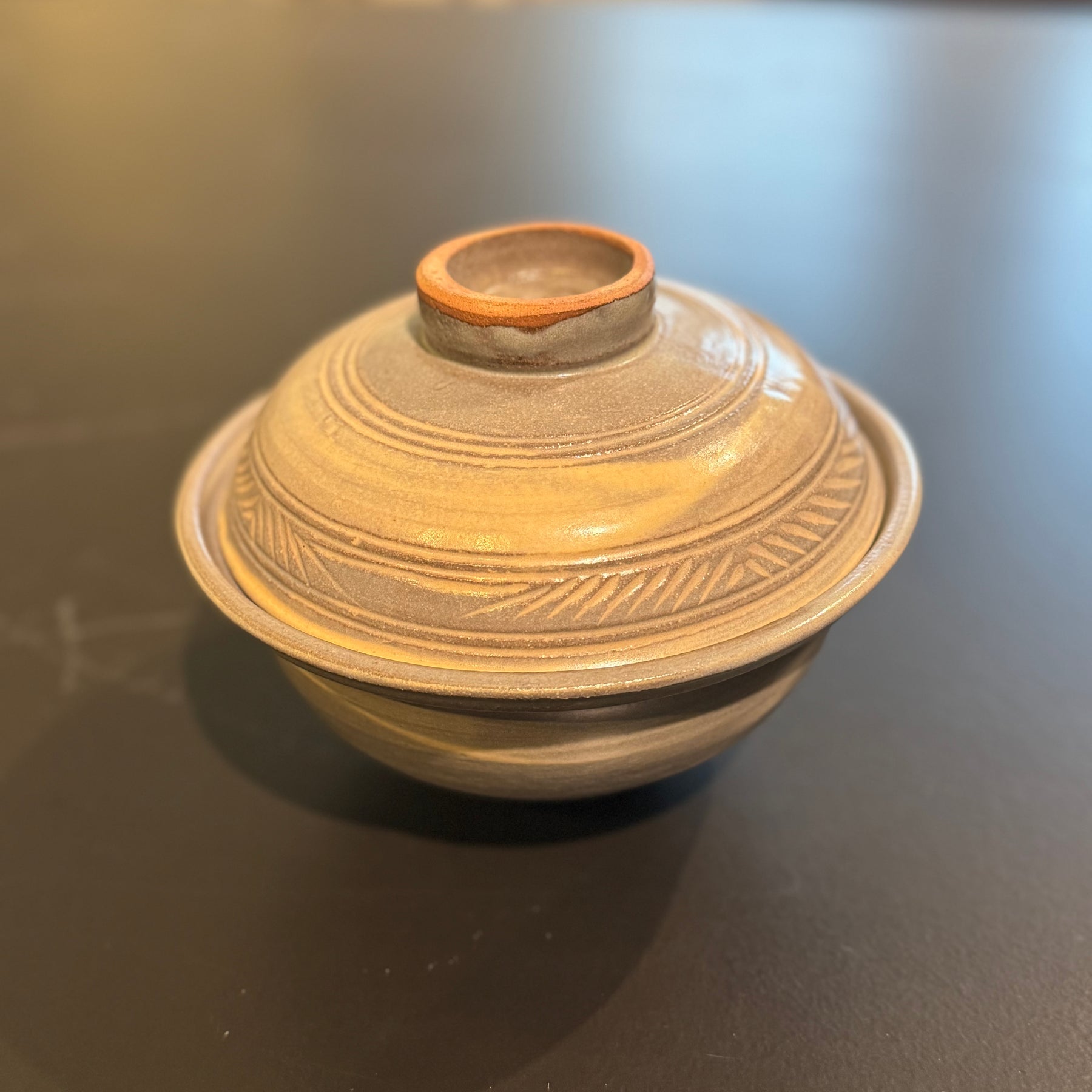 'Benedictine' covered pottery bowl, made by apprentice to Richard Bresnahan for St. Johns pottery. We have an example of Richard Bresnahan's work available at the time of this listing as well. Please inquire for availability if interested.