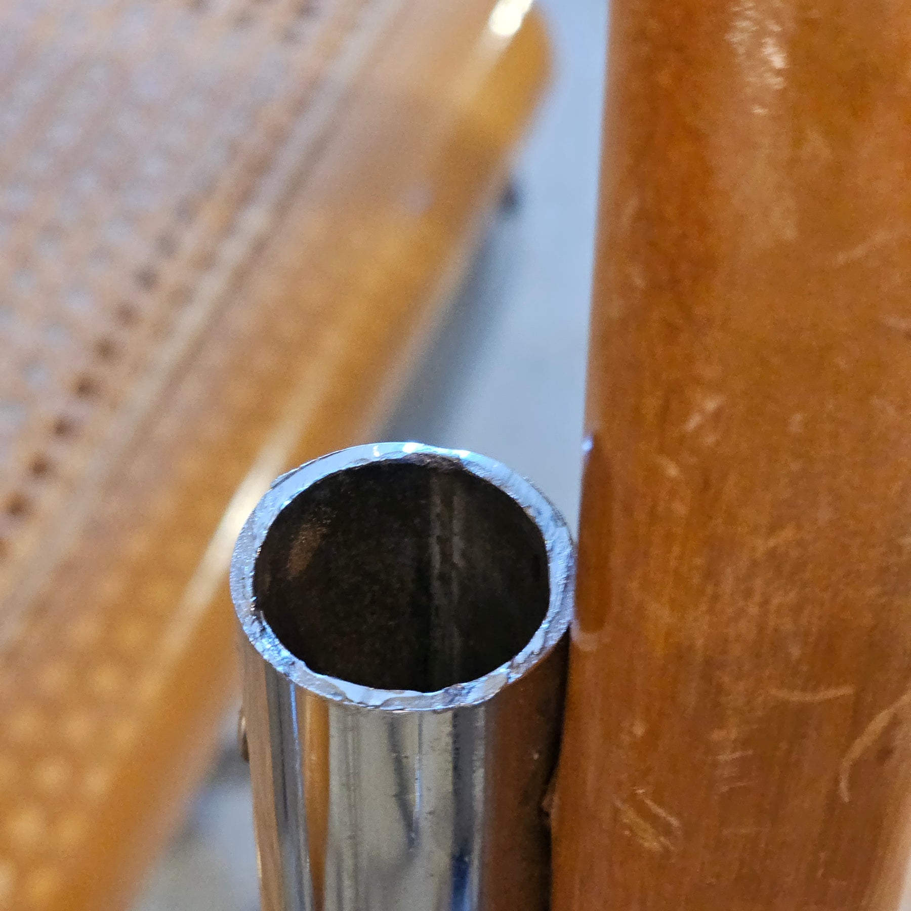 Set of four Cesca style chairs. Caning is in fair-good condition, but one set does show wear/breakage along the front of seat. Additional signs of previous repairs as well as a missing cap piece to one of the frames present. We recommend inspecting in person prior to purchase.