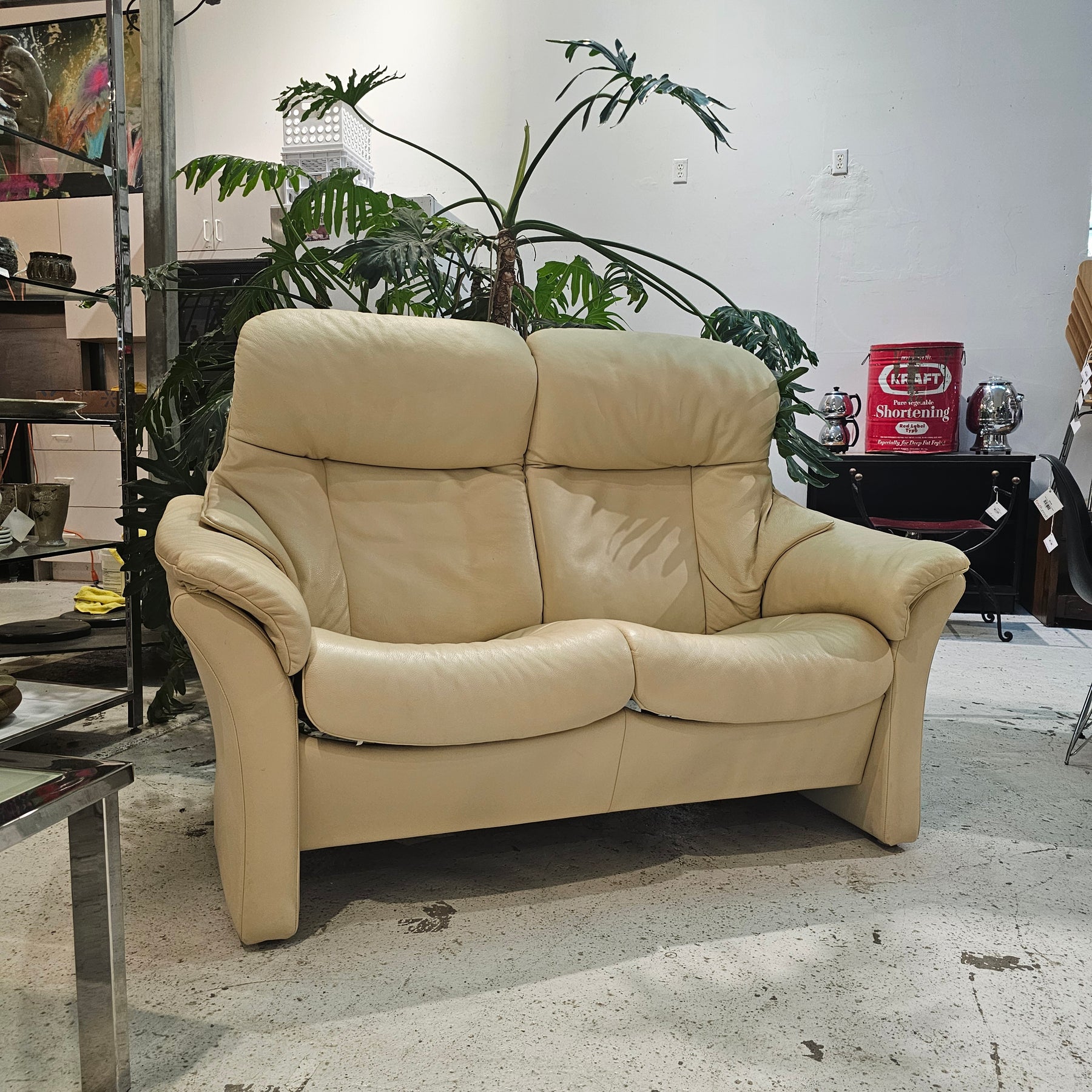 Experience exceptional comfort with the Ekornes Eldorado Leather Reclining Loveseat. Upholstered in elegant ivory leather that remains in excellent condition, this loveseat offers a luxurious seating option. Both sides recline independently, allowing personalized relaxation for you and a loved one.