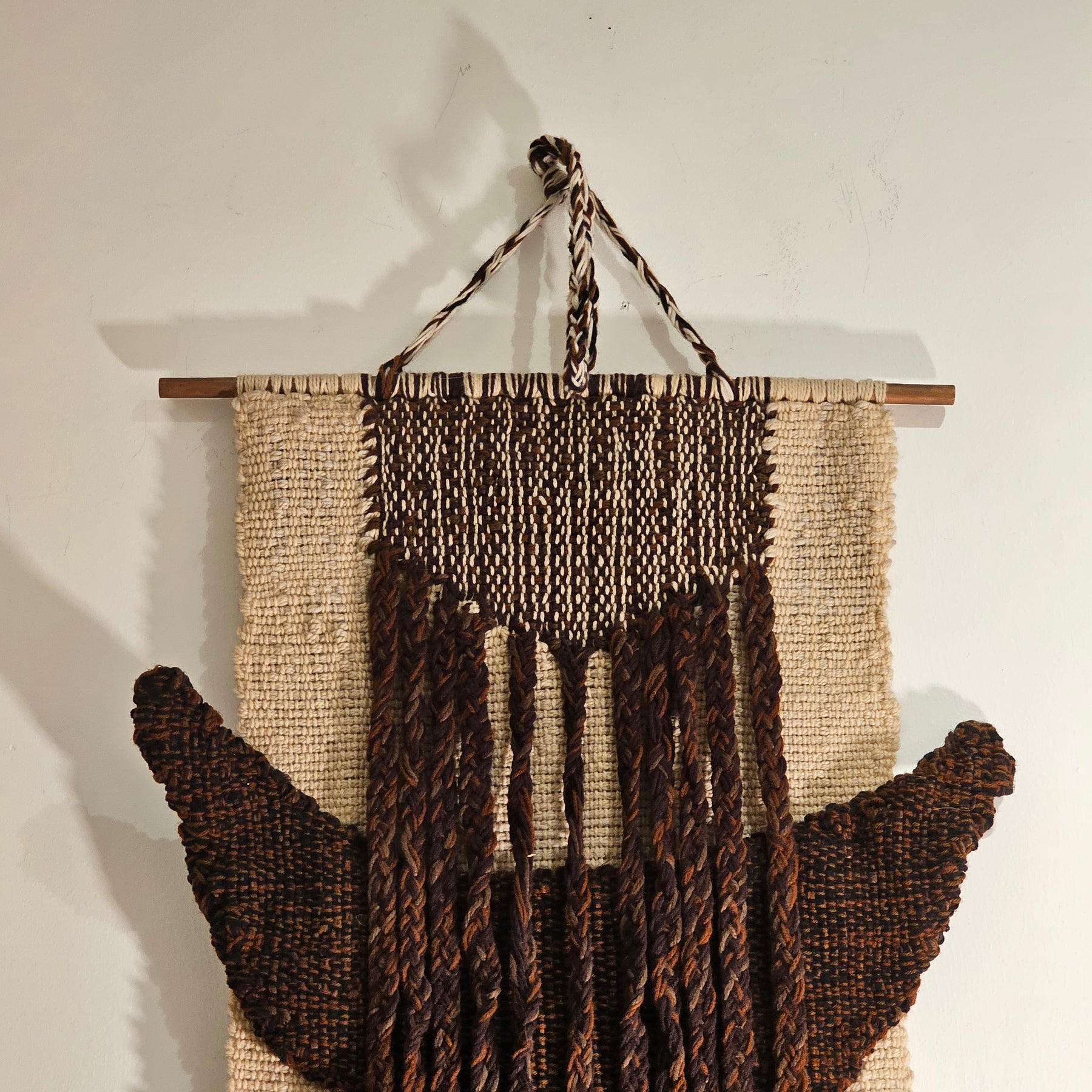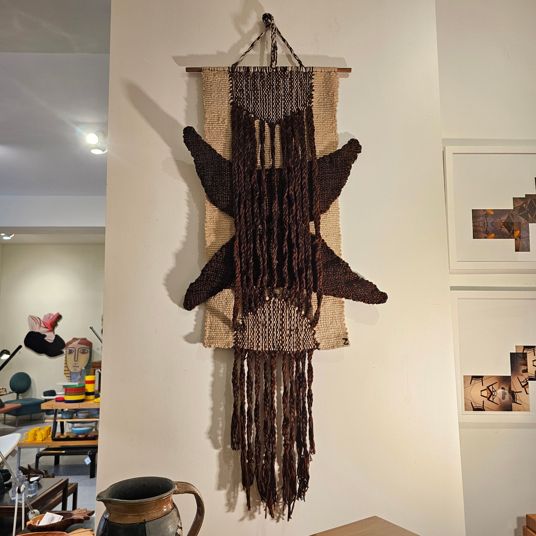 Striking handwoven Japanese wool tapestry, featuring bold geometric and organic forms in natural cream and deep brown tones. Textural braids and fringe add sculpture depth, making it a standout wall piece with both rustic and modernist appeal. Likely mid-20th century, this textile is signed with an initial "Z" in the lower corner.